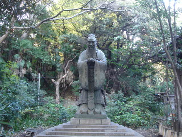 所在地 東京都文京区湯島1-4-25 (湯島聖堂) コノ孔子ノ銅像ハ昭和四十九年臺北城中らいおんずくらぶ周宏基會長等ガ湯島聖堂ニ参拝シ元禄以来三百年ノ由緒アル史跡ニ感銘ヲ受ケ國立臺灣師範大學開明徳教授ニ依嘱製作シ寄贈シタモノデ唐ノ呉道子ノ筆ト傳ヘル孔子畫像ヲ基調トシテ鋳造シ昭和五十年十一月三日文化節ニ建立シタ丈高十五尺重量ニ噸ノ世界最大ノ孔子像デアル茲ニ聊カ建立ノ由來ヲ記シ世ニ傳ヘル 昭和五十七年十月先儒祭ノ日 財團法人 斯文會